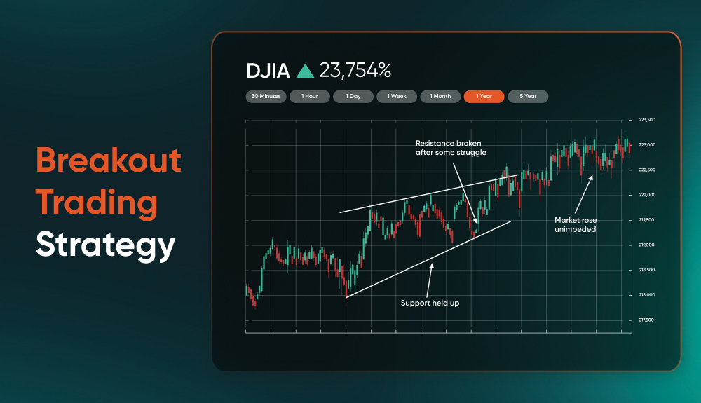 • In breakout trading strategy, a trader looks for a breakout in an index, and places an appropriate trade in response. Breakouts are when an index’s price moves above or below a strong line of resistance or support, accompanied by a clear increase in volume.