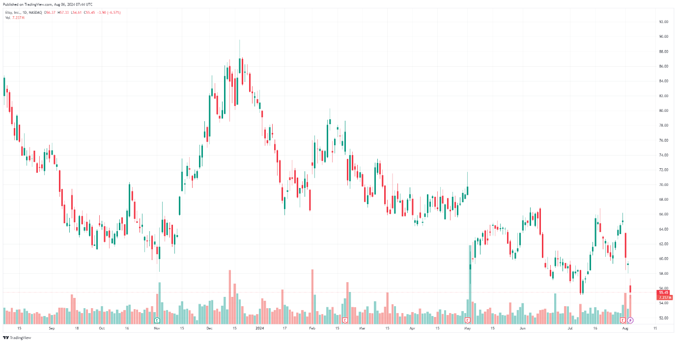 Here is how Etsy Inc has been performing on the stock market for the past year, as of 6 August 2024: