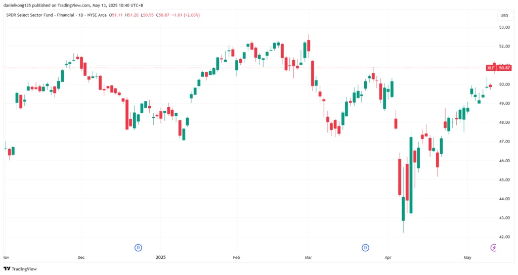 Financials, particularly banks, benefit from higher interest rates, which widen net interest margins. The Fed’s decision to maintain rates at 4.25%-4.5% supports profitability for institutions like JPMorgan Chase and Bank of America. However, tariff uncertainty and potential economic slowdown could increase loan default risks, tempering gains.