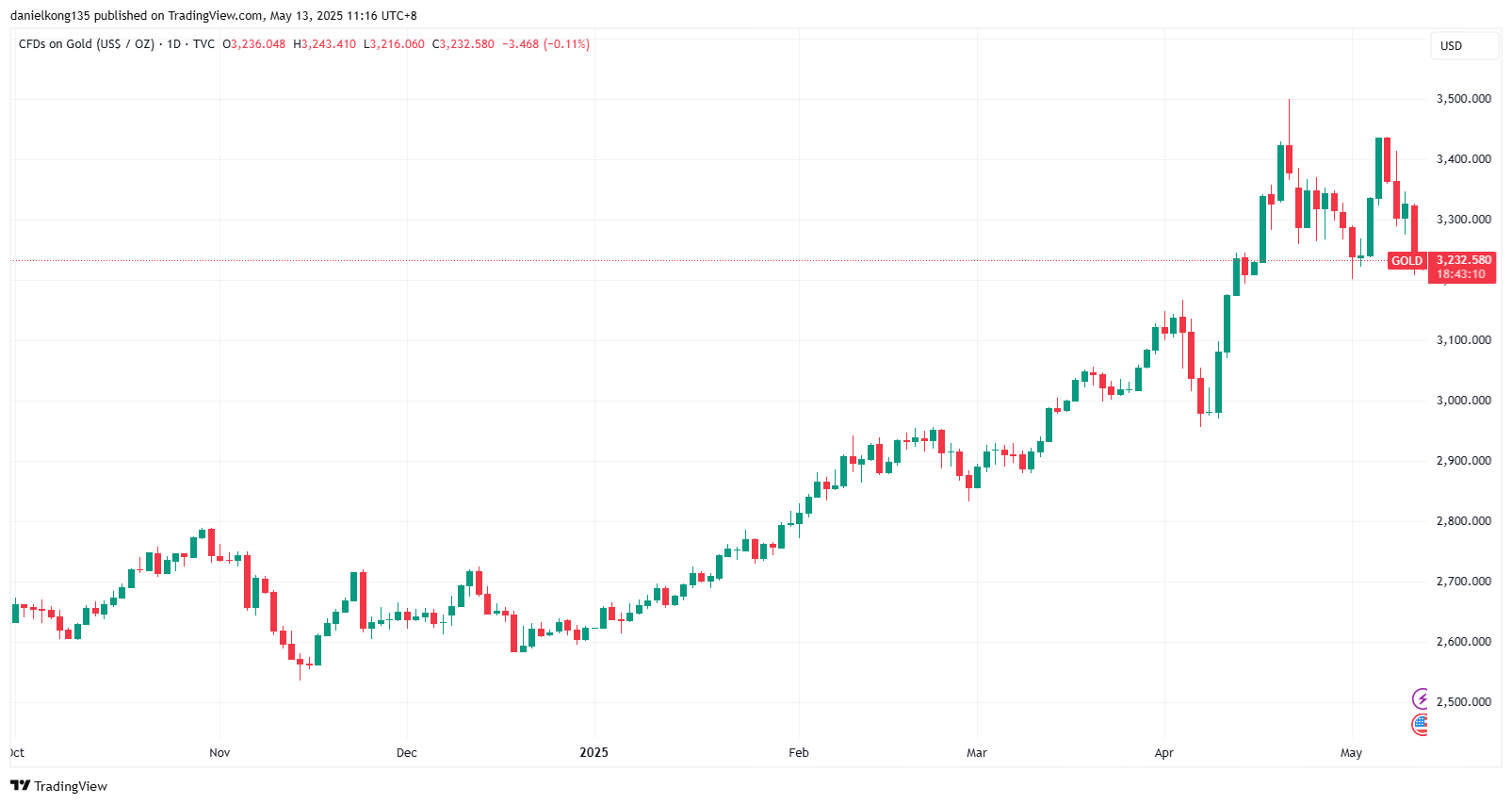 Gold (XAU/USD) has been on a strong uptrend since late 2024, climbing from around $2,800 to above $3,400 before pulling back in April. The price found solid support between $3,000 and $3,100 and has rebounded sharply to around $3,320, forming a potential bullish flag pattern.