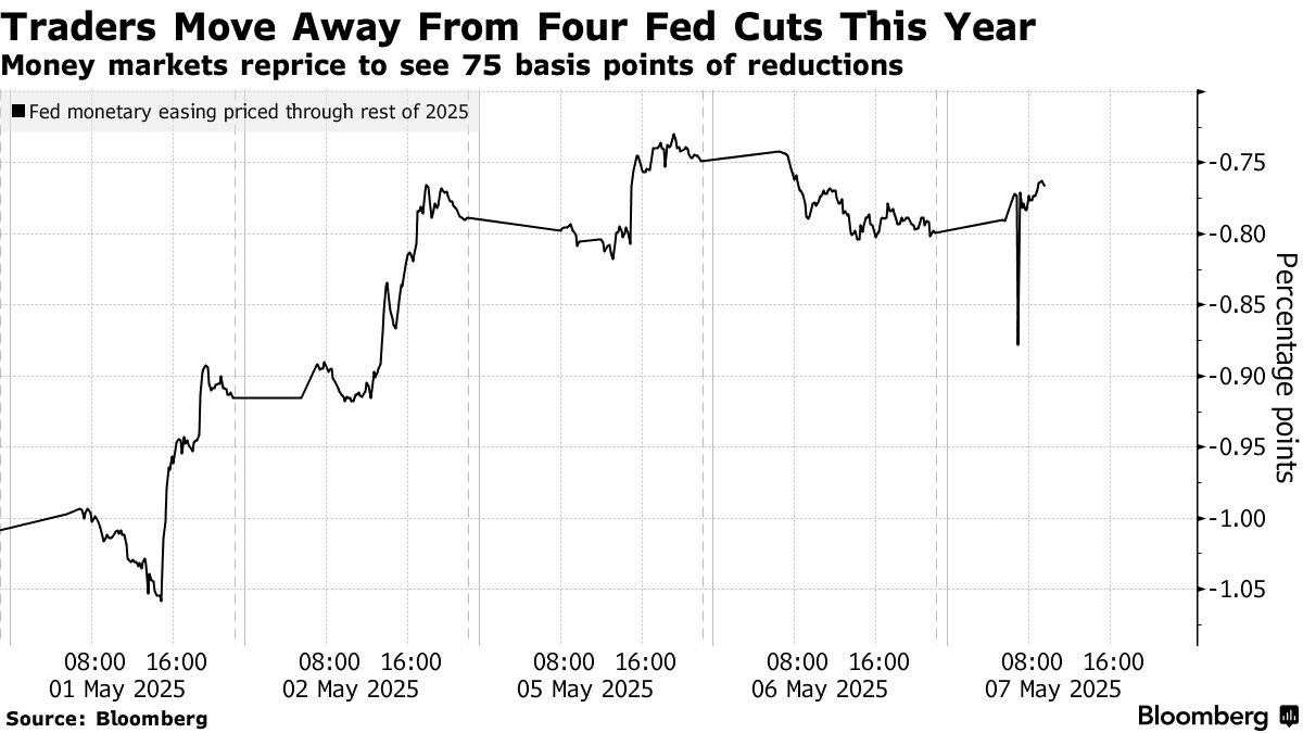 - “Traders Bet It Will Take Longer for Fed to Start Cutting Rates – Bloomberg”. https://www.bloomberg.com/news/articles/2025-05-06/traders-bet-it-will-take-longer-for-fed-to-start-cutting-rates . Accessed 9 May 2025.
