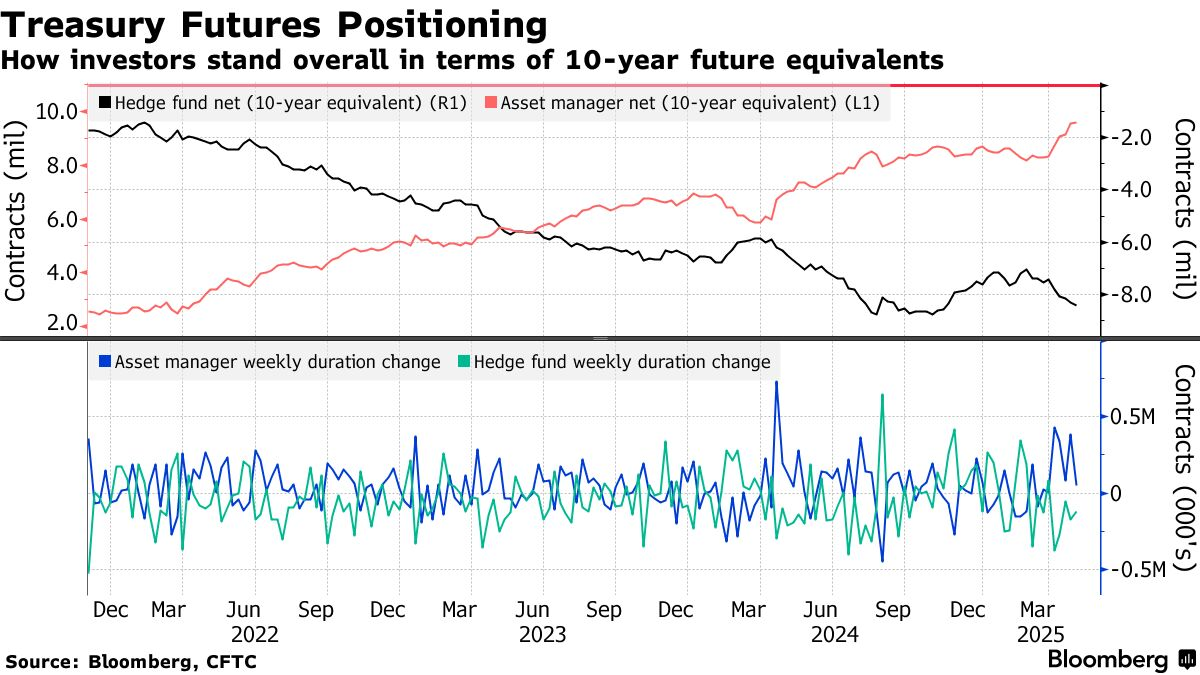 Futures data show asset managers increasing long positions while hedge funds continue to build up short positions, especially in 5-year and 10-year Treasury notes, underscoring mixed views on the timing and magnitude of future Fed easing.