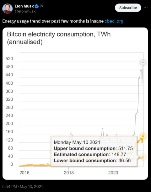 Image 3: Tweet by Elon Musk with a graph showing the Bitcoin electricity consumption (Source: X)
