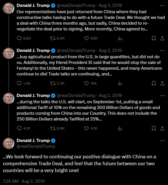 4. “The Dow Tumbled Because Trump Restarted the Trade War – Barrons’”. https://www.barrons.com/amp/articles/president-donald-trump-tweets-new-tariffs-on-china-and-sinks-the-dow-jones-industrial-average-51564683101. Accessed 7 August 2024.