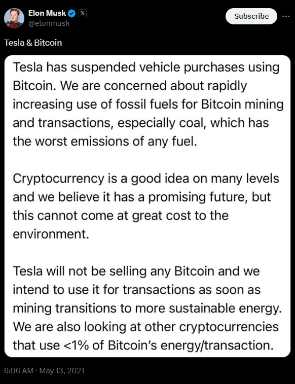 Image 2: Tweet by Elon Musk announcing Tesla will not be using Bitcoin for transactions (Source: X)