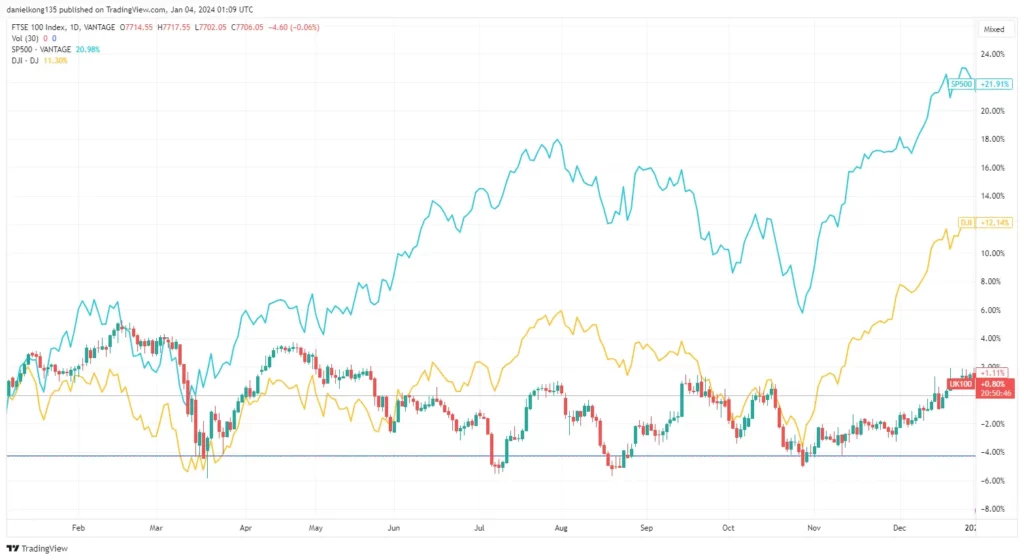 Chart 2: FTSE 100 Index in comparison to S&P 500 and DJI Index (https://www.tradingview.com/x/Zop41LdS/)
