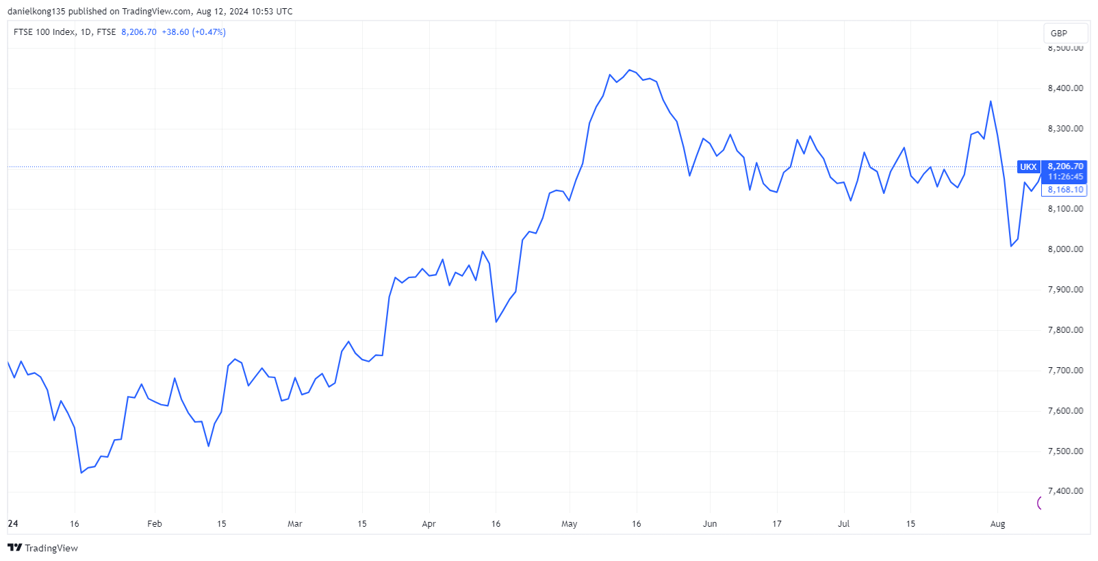 Chart 4: FTSE 100 Index from 1 January 2024 – 9 August 2024 (https://www.tradingview.com/x/oQ6tf8C7/)