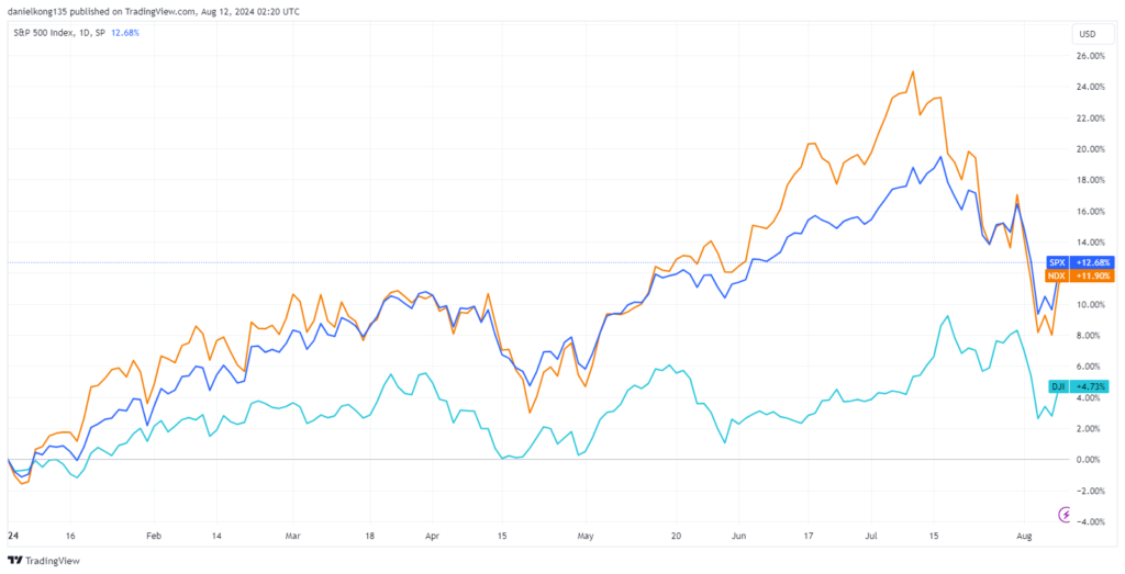 Chart 3: Graph of S&P 500, Nasdaq 100, and DJI from 1 January 2024 – 9 August 2024 (https://www.tradingview.com/x/ZrG7oc0b/