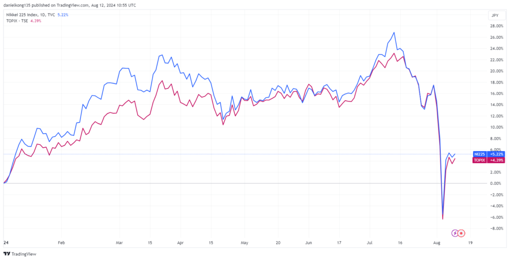 Chart 6:Nikkei 2245 and Topix Index from 1 January 2024 – 9 August 2024 (https://www.tradingview.com/x/RSKp4peQ/