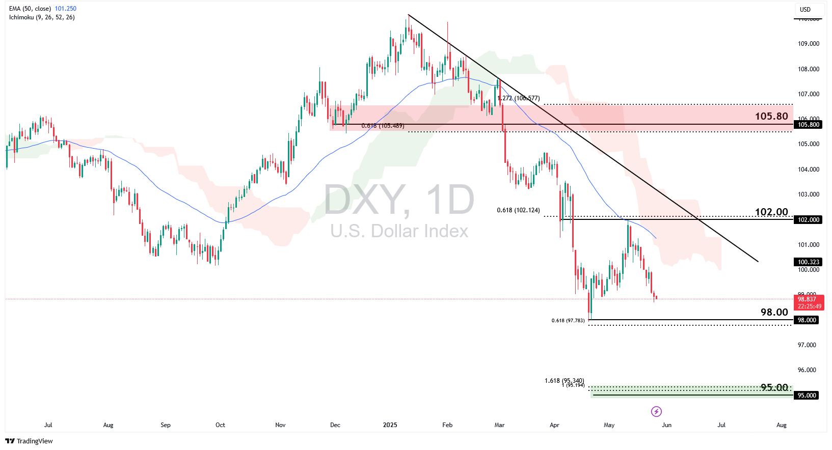 DXY’s price action remains firmly bearish, as it continues to trade below key technical indicators: the Ichimoku cloud, the 50-day EMA, and the descending trendline. A decisive break and close below the 98.00 swing low support, aligned with the 61.8% Fibonacci Extension would signal a continuation of the downward trend. If this occurs, the price could further test the 95.00 support level, which corresponds to both the 100% Fibonacci Extension and the 161.8% Fibonacci Retracement levels.