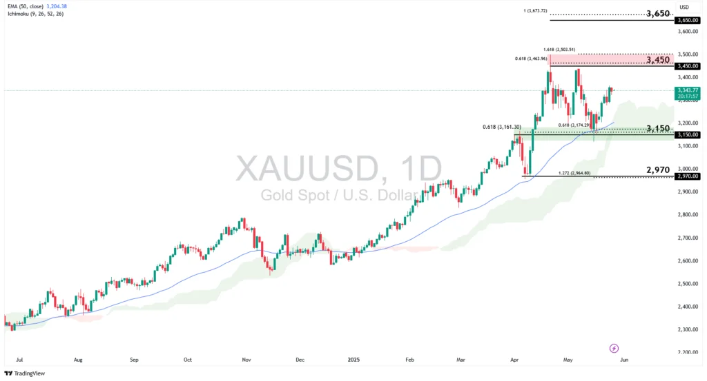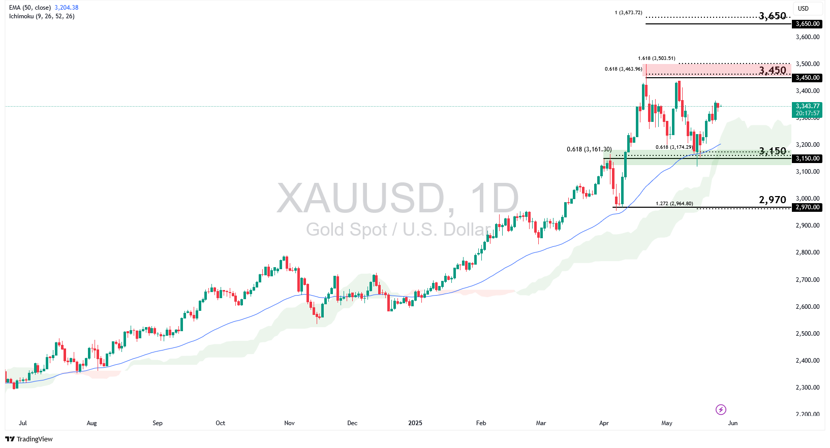 XAUUSD continues to hold above the Ichimoku cloud and 50-EMA after the price bounced off the $3,150 support zone, in line with both the 61.8% Fibonacci Retracement and Extension levels. With the continuation of bullish momentum, we could potentially see the price retest the $3,450 swing high resistance, in line with both 61.8% and 161.8% Fibonacci Extension levels. If the rally continues, XAU/USD could climb toward a new high at $3,650, which aligns with the 100% Fibonacci Extension.