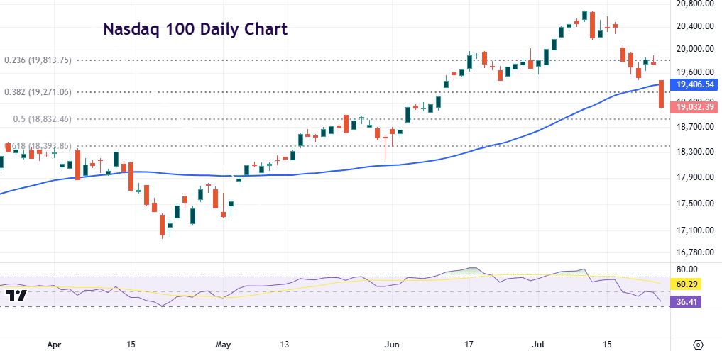 Seasonal challenges mount for stocks as we head into late July where the mid-year slump in risk assets typically starts to bite the most. Equity markets typically run relatively soft through August and especially September before rallying strongly into the final quarter of the year. Nasdaq prices slid through a Fib level at 19,271 and the 50-day SMA at 19,406. Next support is the 50% retracement of the April low to July high at 18,832. Markets will be wary of more Big Tech earnings next week from Microsoft on Tuesday, Meta on Wednesday and Amazon and Apple on Thursday, all after the US closing bell.