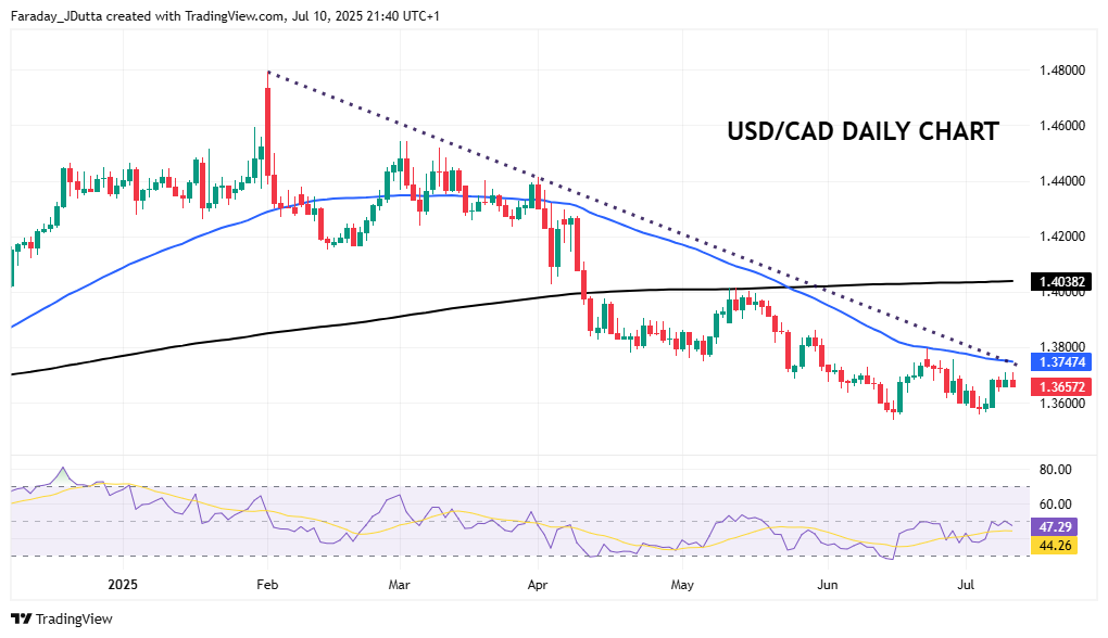 GBP printed a doji candle denoting some indecision with a nigh-on unchanged close. Today’s data could help shape the BoE next meeting on 7 August. A 25bp rate cut is virtually fully priced with just over 50bps in total for 2025. The 50-day SMA at 1.3487 has acted as decent support this year.