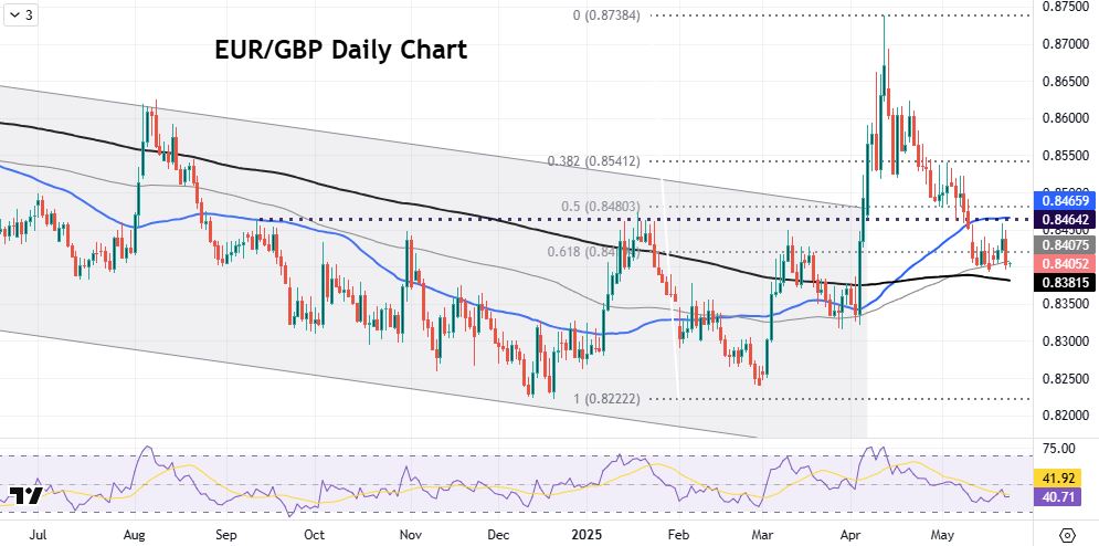 Long end Gilt underperformance due to fiscal risks weighed on sterling earlier this year. Prices broke out of the long-term bear channel in early April, eventually spiking to 0.8737. Some relief kicked in as President Trump appeared to be more forgiving towards the UK when it comes to tariffs. Recently, UK economic data has been mildly better than expected, while the Bank of England at its recent May meeting, held onto a path of gradual easing. This is in contrast to a dovish ECB, whose officials continue to want more easing. This helped has sterling to further regain some lost territory. Prices have dipped below support/resistance at 0.8464. Below here is support at the 100-day and 200-day SMAs at 0.8407 and 0.8381. There is also a Fib level of the December to April rally at 0.8419.