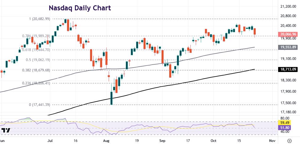 The index hasn’t quite recovered all of its losses from the record high set in July. Prices look to have moved decisively above a minor Fibonacci retracement level (78.6%) of the summer sell-off at 19,989. But last week’s top is 20,493 which resides just below the all-time peak at 20,682 is proving tough resistance. We get a slew of megacap tech earnings coming soon with Meta, Microsoft, Apple and Amazon all reporting on Wednesday and Thursday next week.