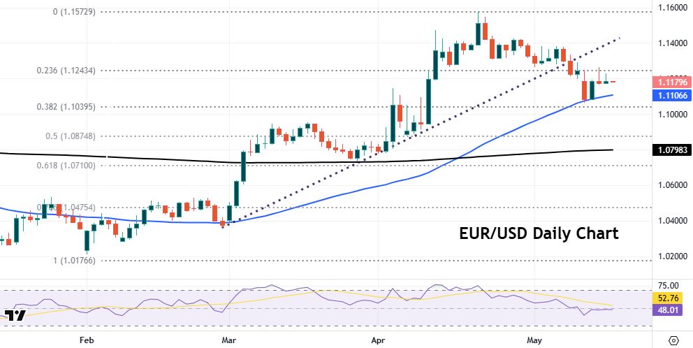 Unsurprisingly, with little major news flow, this week’s recovery in EUR/USD looks to have stalled and we are seeing some congestion around 1.12. The RSI is remarkably quiet as it chops either side of 50, indicating limited momentum. Near-term support is seen at the 50-day SMA at 1.1106 and recent resistance has been observed around 1.1243. That is a minor Fib retracement level of this year’s rally. The upward trendline from the late February low has been broken but it’s not been majorly confirmed.