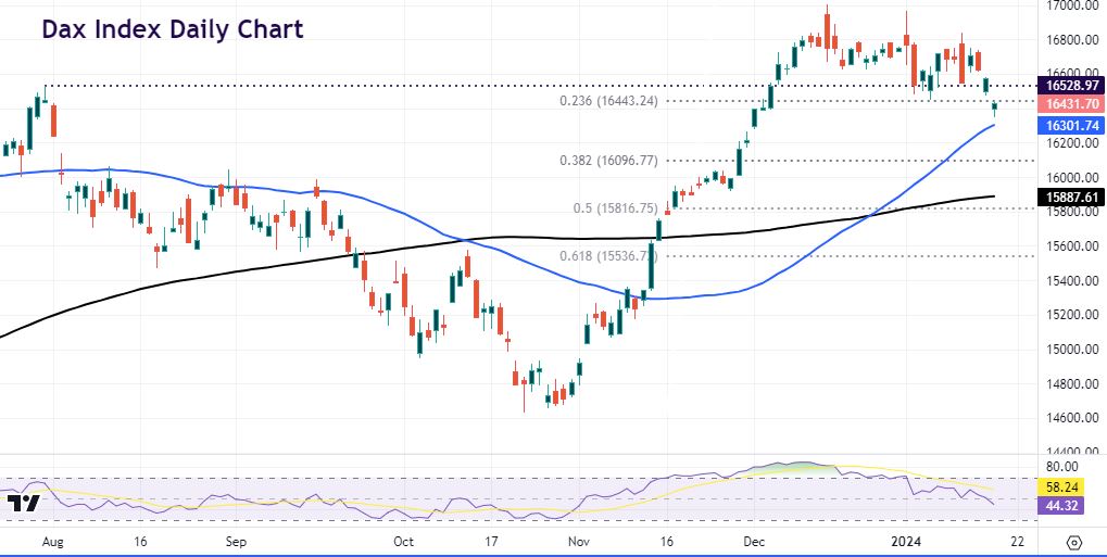 The Dax looked to be supported by the July top at 16,528. Prices bounced off this level at the start of the year. But the index has dropped through here and a minor Fib level of the November rally at 16,443. The 50-day SMA sits at 16,301 as next support.