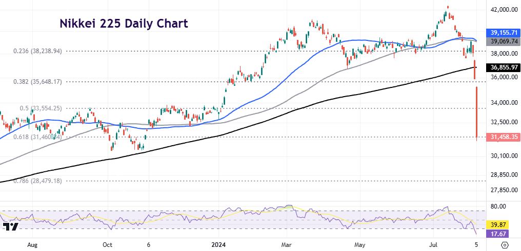 Technically, prices crashed to a long-term Fib retracement level (61.8%) of the March 2022 low and recent July high at 31,460. The midpoint of this move sits above at 33,554. The index is heavily oversold over numerous measures.