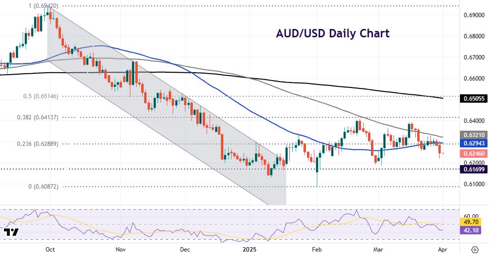 The aussie has been in the crosshairs of a potentially deteriorating global trade environment in the last few weeks. In fact, it was barely in the green versus the dollar in March, as the worst performing major currency. A cautious message is predicted from the RBA, with plenty of focus on the tariff uncertainty and more softening in inflation needed for policy easing. Going forward, AUD may not see much support if US trade policy pushes the wider economy into a prolonged slowdown. A long-term low at 0.6169 from October 2022 is key support, with the January year-to-date spike trough at 0.6087. The 50-day SMA and a Fib level at 0.6288/93 may offer initial resistance.