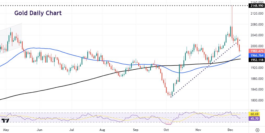 Gold fell back below $2000 as bearish momentum picked up. See below for more commentary.