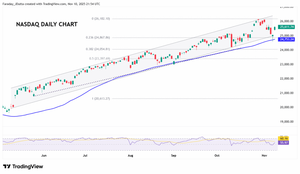 US stocks: The S&P 500 gained 1.54%, closing at 6,832. The Nasdaq moved higher by 2.2% to settle at 25,612. The Dow Jones finished at 47,369, up 0.81% on the day. All sectors were green apart from three with Tech, Communication Services and Consumer Discretionary up from 2.69% to 1.49%. Those mega-cap sectors outperformed with all Mag-7 names in positive territory. Consumer Staples was one of few sectors in red and saw a lack of demand due to its risk-off defensive characteristics. Nvidia surged 5.8% and Palantir added 8.8% after progress in Washington to end the 40-day and longest government shutdown. ‘Buy the dip’ has once again lifted tech and AI stocks after both the S&P 500 and the Nasdaq bounced off their 50-day SMAs as support. Eli Lilly rose 4.6% to a record high