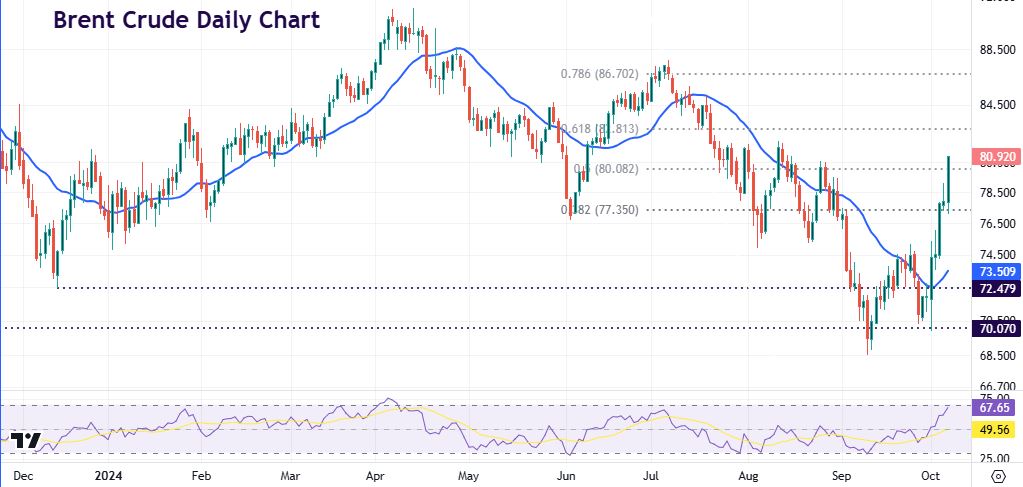 Iran produces roughly 1.7million b/d so that loss would be enough to push the global market back into a sizeable deficit from Q4 through 2025. OPEC+ could then gradually unwind 2.2m b/d of additional voluntary cuts. The Strait of Hormuz is certainly the biggest issue. A third of all seabourne oil moves through there, so 14 million b/d of oil supply at risk. There could also be potential LNG disruption from Qatar which has 20% of global LNG trade. Brent prices broke through the 50% retracement of the April to September sell-off at $80.08. Next resistance is $82.81, then $86.70 and $91.65, with support around $80.