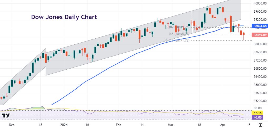 Technically, the Dow broke down sharply last Thursday out of this year’s bull channel. Prices recently dropped below the 50-day SMA at 38,894 and yesterday tapped a major Fib level of the 2024 rally at 38,171. The 38,000 psychological level beckons if we lose that support.