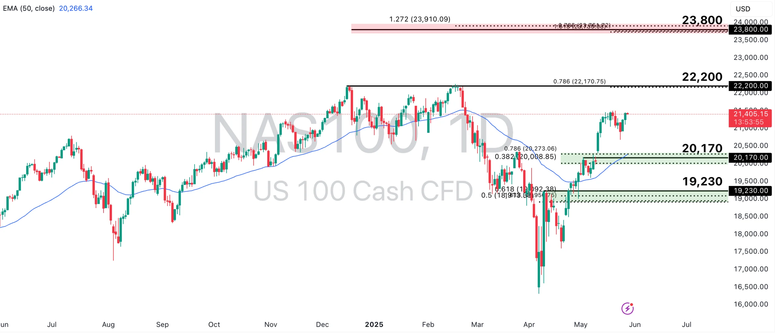 NAS100 has seen a bullish reversal since April 2025 and now holds above the 50-EMA. A continuation of this bullish momentum would see the price approach the 22,200-point swing high resistance, in line with the 78.6% Fibonacci Extension level, or even towards the 23,800-point resistance level, in line with the key zone of Fibonacci confluence.