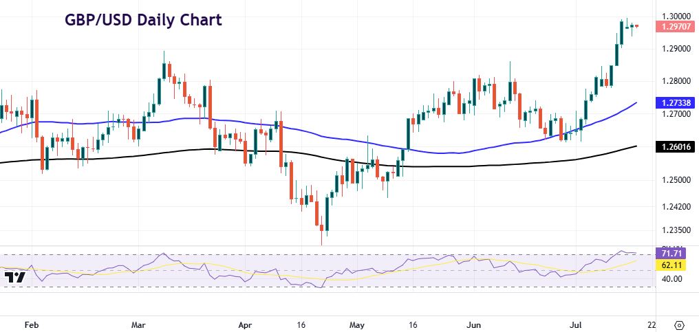 Bulls have recently taken GBP/USD near to 1.30 which is a one-year high. But prices are overbought which gives a warning that cooler CPI and other UK data could see some selling. The March top is 1.2893. Of course, the flip side and stronger data would likely push cable higher beyond 1.30. It might also pull EUR/GBP closer to long-term lows around 0.8339.