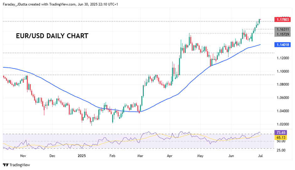 FX: USD was down for an eight straight day as it hit levels last seen in 2021. It looks like we haven’t seen that many down days in a row since October 2004. The Dollar Index was on track for its biggest first half drop since the early 1970s. We are half way through the year and the weak dollar undertone persisted, with risks around trade and fiscal policy again under the microscope. Momentum is firmly bearish after the big outside week, ahead of Thursday’s NFP and looming tariff deadline next week. Continued attacks on the Fed’s leadership are also undermining the appeal of the dollar.