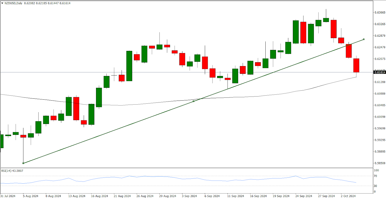 On the NZDUSD weekly chart, bearish pressure was evident and the market closed at 0.6154. Although it traded above the 50 MA, a break below the uptrend line at 0.6287 indicates a possible trend reversal towards the 0.5850 zone.