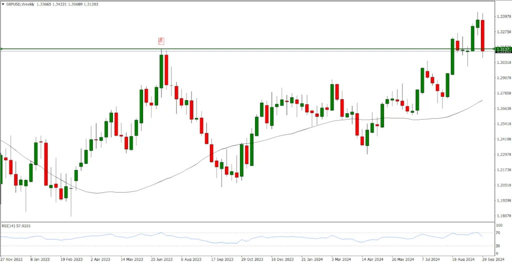 The GBPUSD weekly chart reflects a strong bearish trend closing at 1.3117. Although it remains above the 50 MA, the breach of the previous support at 1.3137 suggests a possible downside reversal. Continued downward momentum could target levels near 1.2660 and 1.2290, with a dip below the 50 MA increasing the risk of further declines.