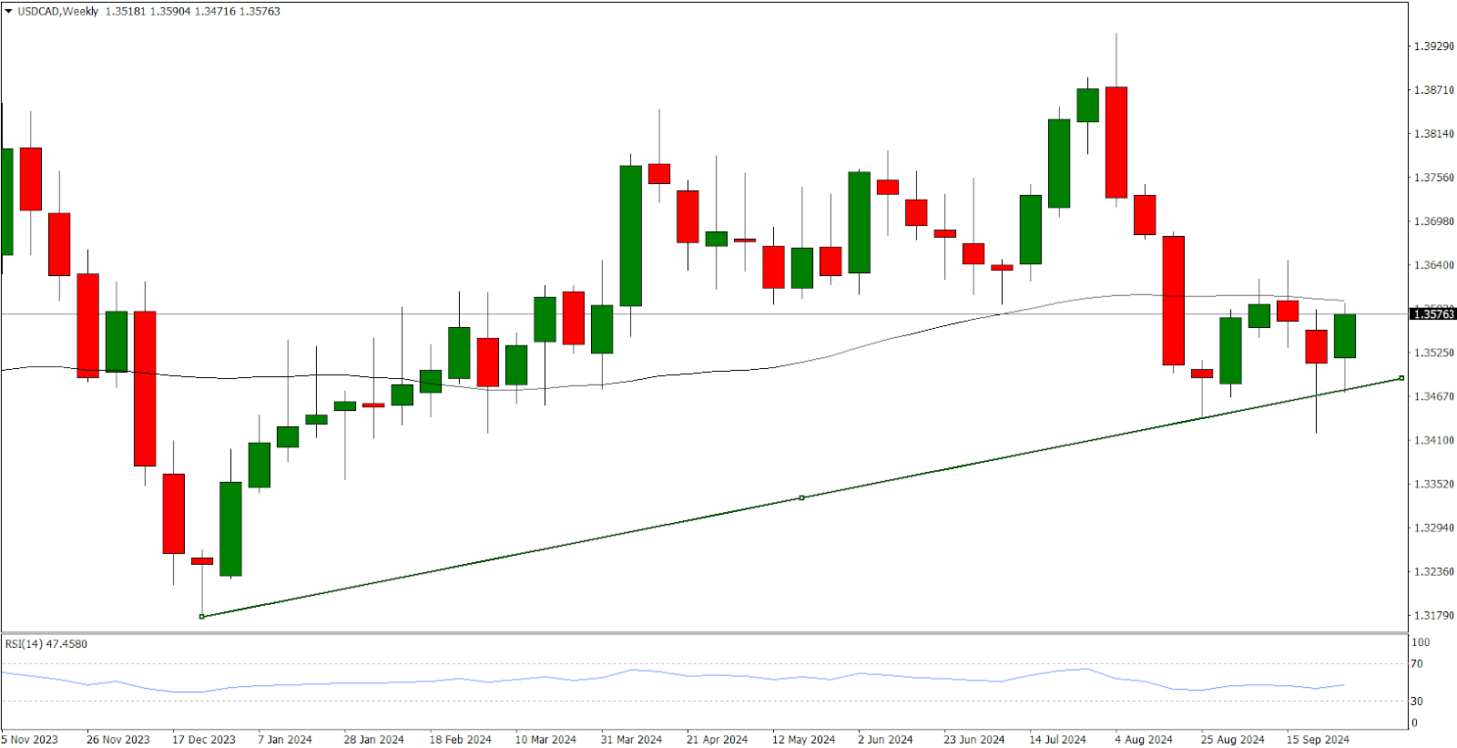 The USDCAD weekly chart showed bullish momentum closing at 1.3573. Despite a bearish signal from the 50 MA, the bounce from the uptrend line at 1.3418 indicates upside potential. If this support holds, targets of 1.3650 and 1.3950 are possible. A breakout above the 50 MA would confirm continued bullish momentum.