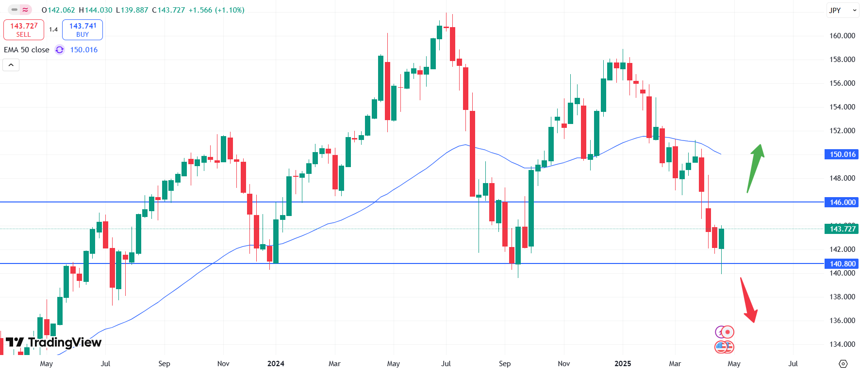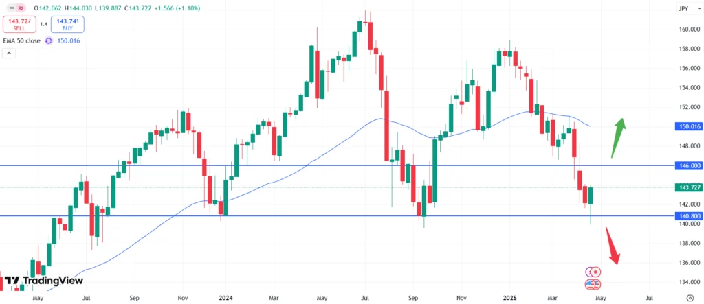 The USDJPY currency pair has recently bounced off the important support zone at 140.80. Upside potential in the wide trading range might hence be the result. Positive data might offer the chance that the market could rise towards the 146.00 zone. The index from the US will be published on the 02nd of May, 2025 at 13:30 CET.