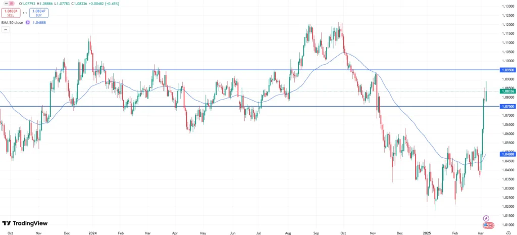 The next resistance zone at 1.0950 is in close proximity and might be tested anytime soon. The lower band at 1.0750 currently offers a potential support zone, based on past price action. The index will be published on Wednesday, the 12th of March at 13:30 CET.