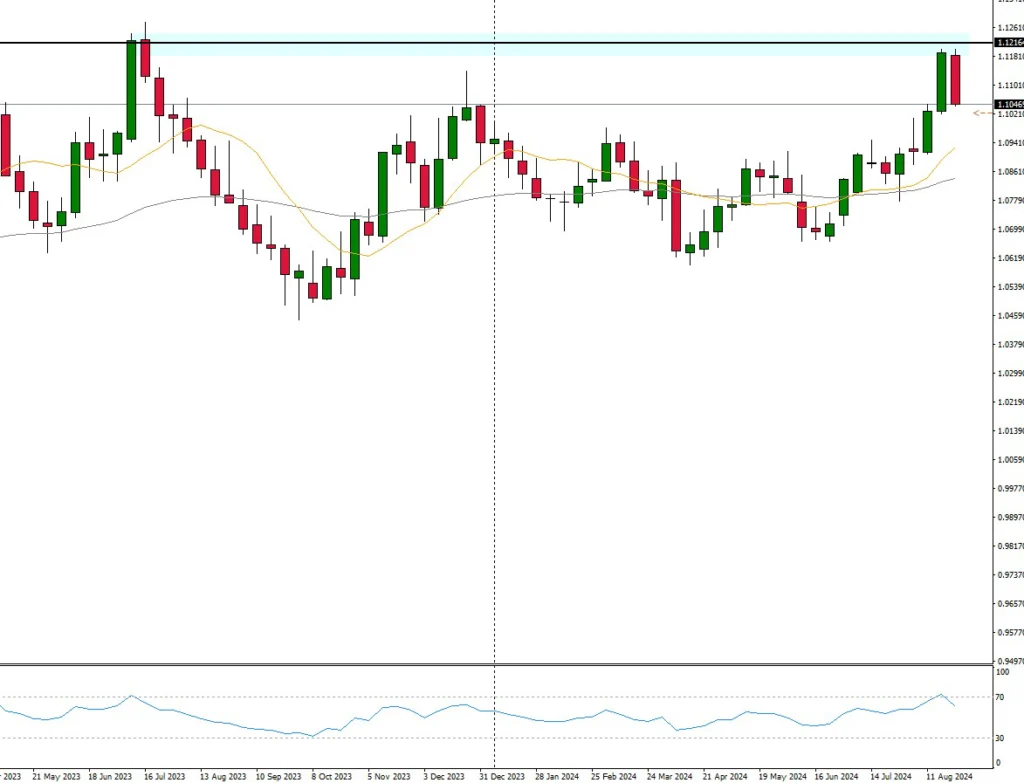 The weekly chart of the EURUSD currency pair indicates that the market appears to be moving downwards again at the important resistance level of 1.1200. This movement could continue in the coming trading days. This movement could continue in the coming trading days. Better-than-expected data in particular could underpin this trend and the Dollar could rise. However, should the market break through the important resistance, new potential towards the 1.1400 – 1.1500 zone could emerge. The figure will be released on Thursday the 5th of September at 14:15 CET.