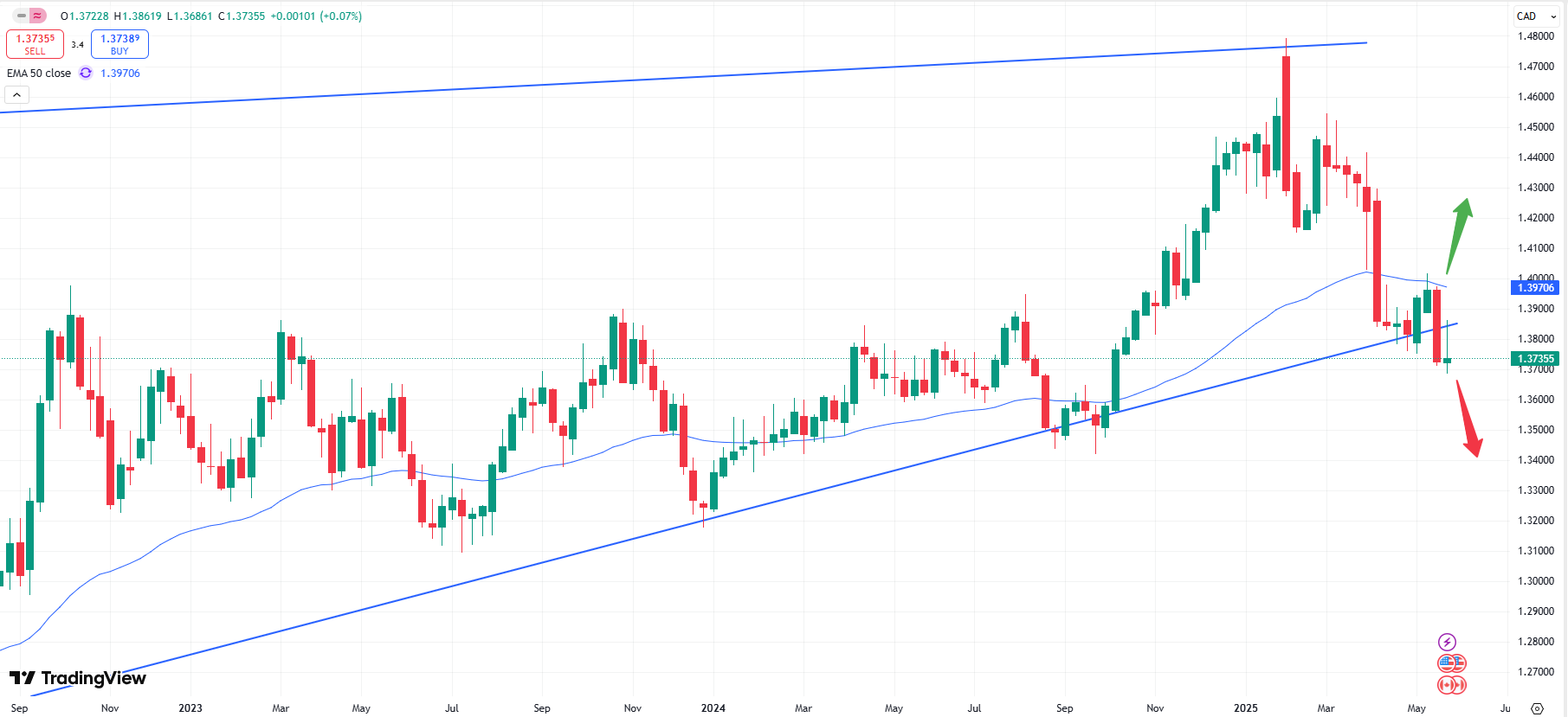 Following the bearish break below the important rising trendline as the chart above shows, more downside momentum might occur. Any price below the 1.3850 zone might hence be used as an entry opportunity. The interest rate decision will be held on Wednesday, June 04 at 15:45 CET.