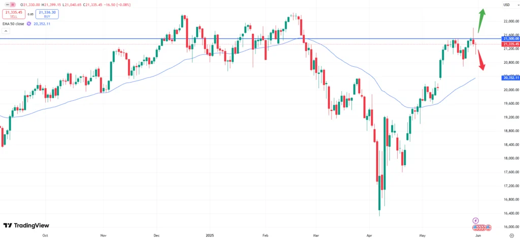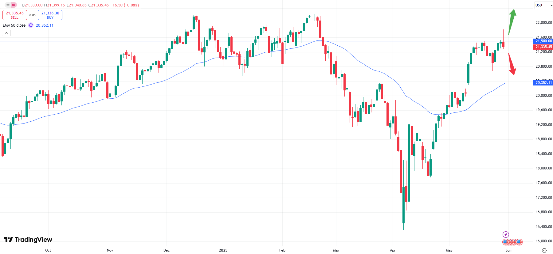 The monthly chart above shows, that the Nasdaq100 index kept rising but might currently face some profit taking. Being capped below the all- time- high from earlier this year the market might remain in a sideways pattern with the current uncertainty. With 130,000 new jobs created, the data is expected to be rather low. A positive surprise could therefore give the market another boost. The employment data will be released on Friday, June 06 at 15:45 CET.